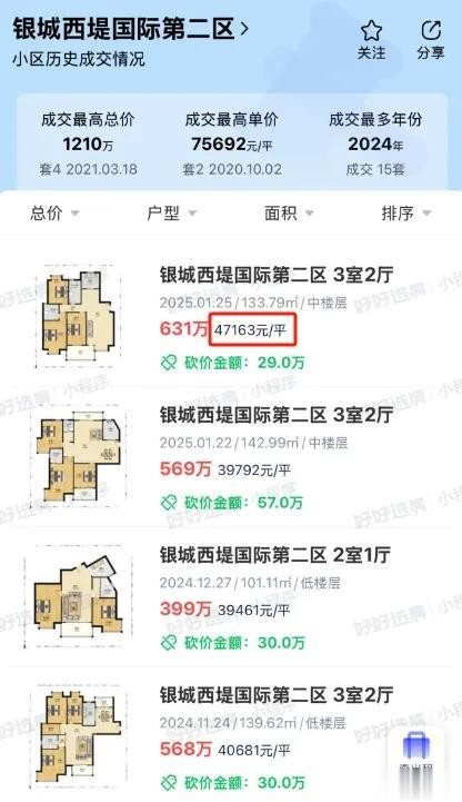 2、银城西堤国际最新一套二手房成交单价4.7万/㎡,要知道,这家楼盘巅峰时期卖到7万多/㎡,去年一度跌破4万/㎡,很多人还等着抄底,结果最新一套价格直接飙到4.7万/㎡。
