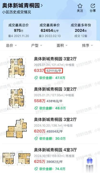 3、奥体新城青桐园今年1月底,成交了一套121.47㎡的中楼层成交价5.2万/㎡。